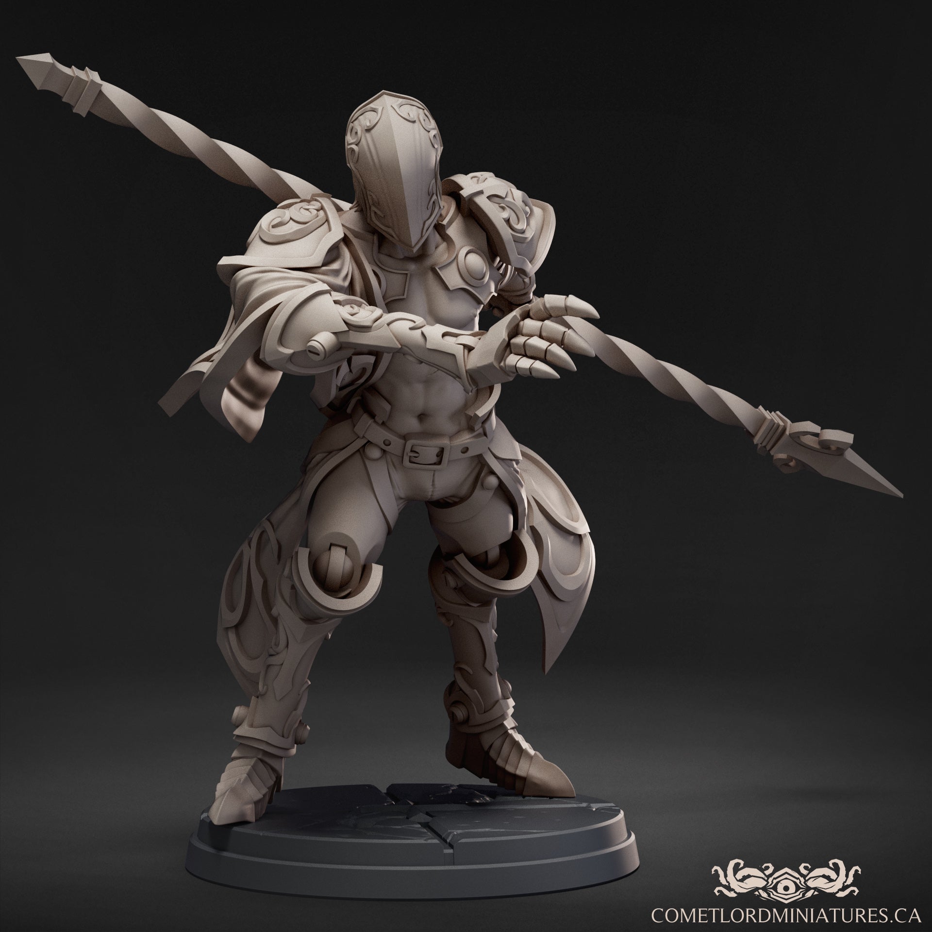 Thane stands on a 25.4mm/1inch base. Thane includes 3 poses, each with a masked variant plus a spiritual weapon of his spear. This miniature comes with optional presupported files for resin printing. These files come as ready to go STL files or Lychee files if you wish to edit the supports for your custom needs.